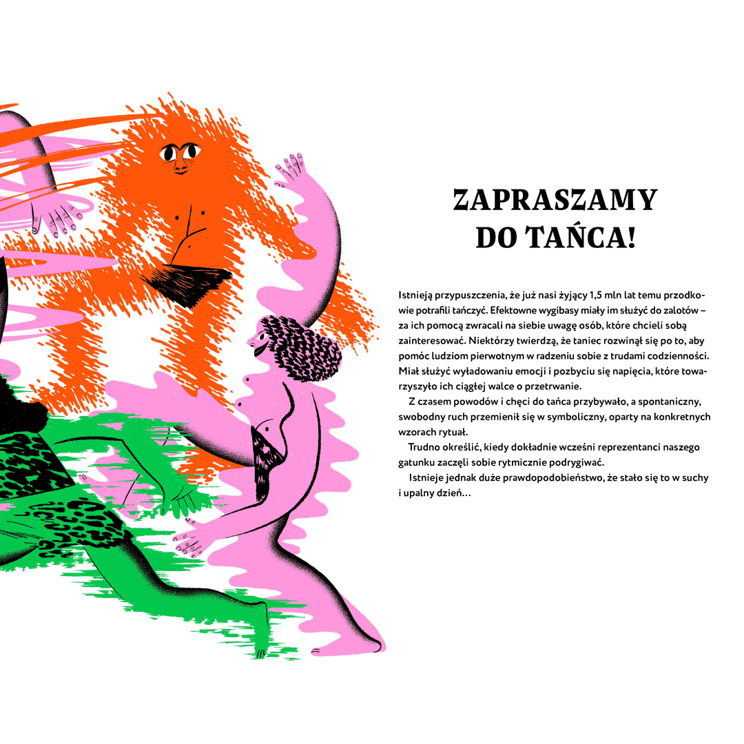 Zuzanna Kisielewska zabiera młodych czytelników w fascynującą podróż po świecie tańca – jednej z najstarszych form ludzkiej ekspresji. Snując opowieści o pradawnych rytuałach, tańcach deszczu, dworskich balach, religijnych transach, współczesnych formach protestu i scenicznych widowiskach, pokazuje, że taniec to coś więcej niż kroki i figury – to język emocji, narzędzie komunikacji, sposób budowania wspólnoty i narracja o człowieku.