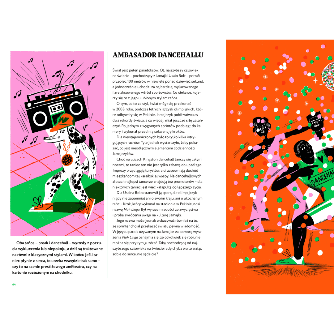 Autorka prowadzi czytelników przez kontynenty i epoki, odkrywa przed nimi tańce duchów z Ameryki Północnej, wirujących derwiszy, indyjskie katakali, ukraiński hopak czy afrykański taniec w kaloszach. Z lekkością i humorem łączy antropologię, historię, sztukę i pasję ruchu, udowadniając, że taniec jest integralną częścią kultury.