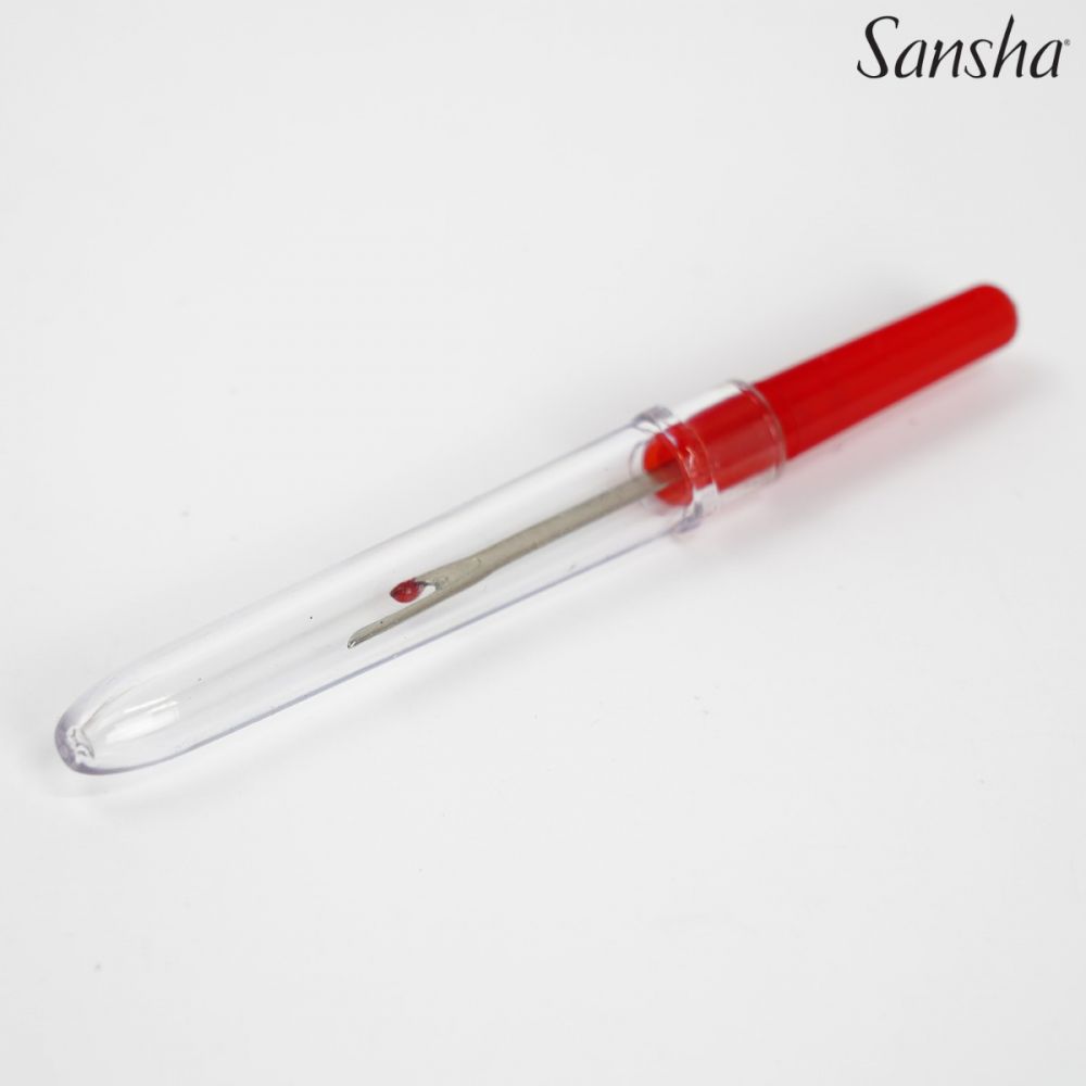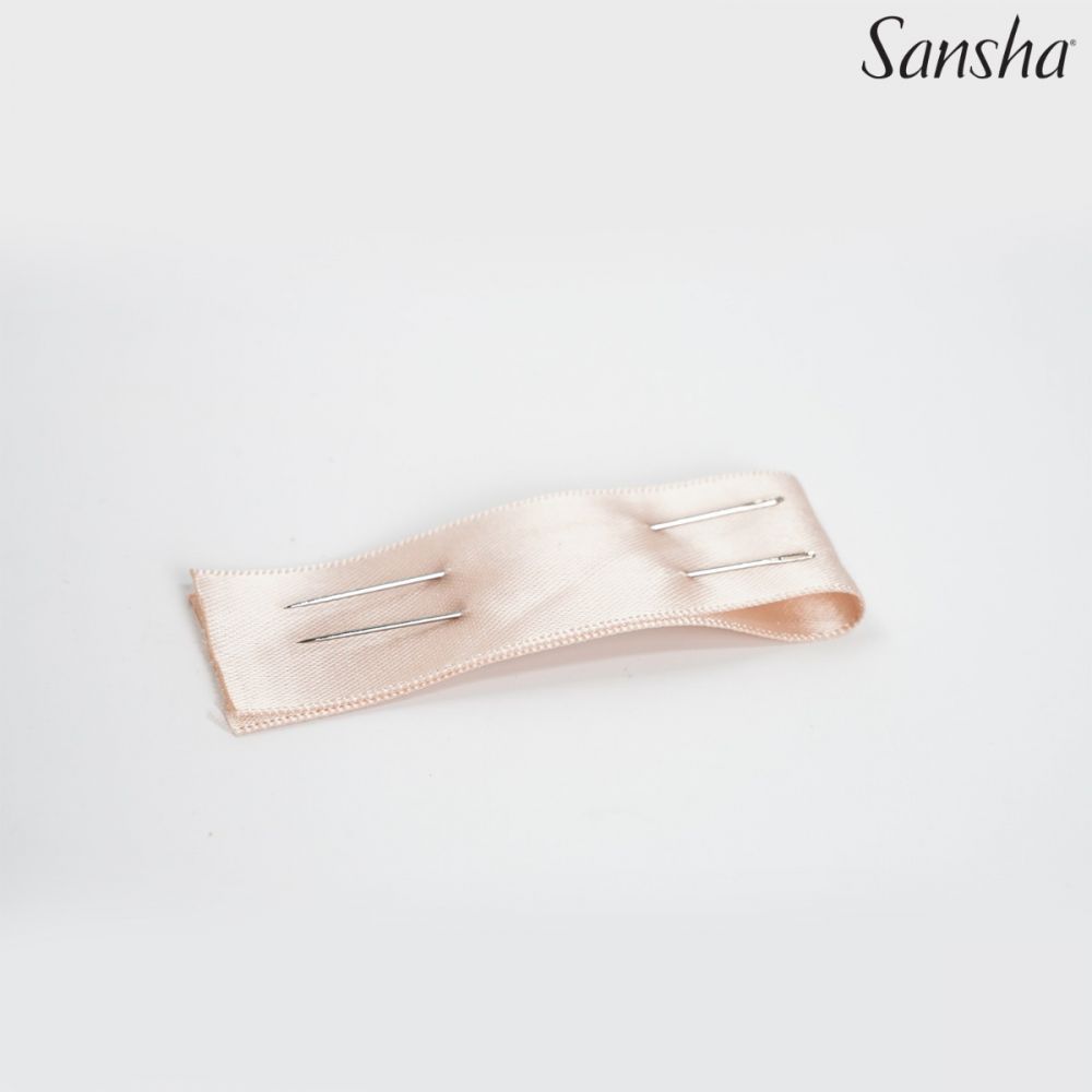 Pudełko w kolorze różowym zawiera troczki satynowe, wąskie, mocne gumki do point, igłę i nitkę do szycia oraz przyrząd do prucia.